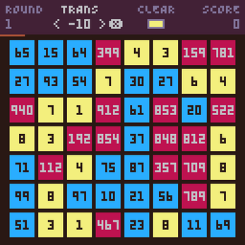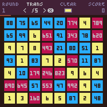 - Transform: You'll select one of the 3 available arithmetic operations (e.g. "+100", "/2", "x10"), which will be applied to every number on the table. This, in turn, will result in a new set of numbers. Some of them might go out of scale and will be removed. When the round ends, a new random operation will replace the one you chose.